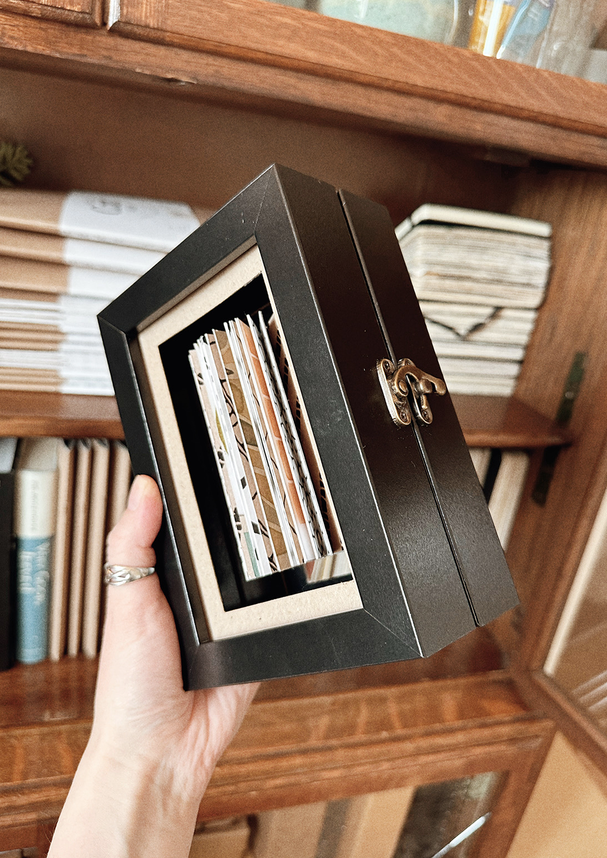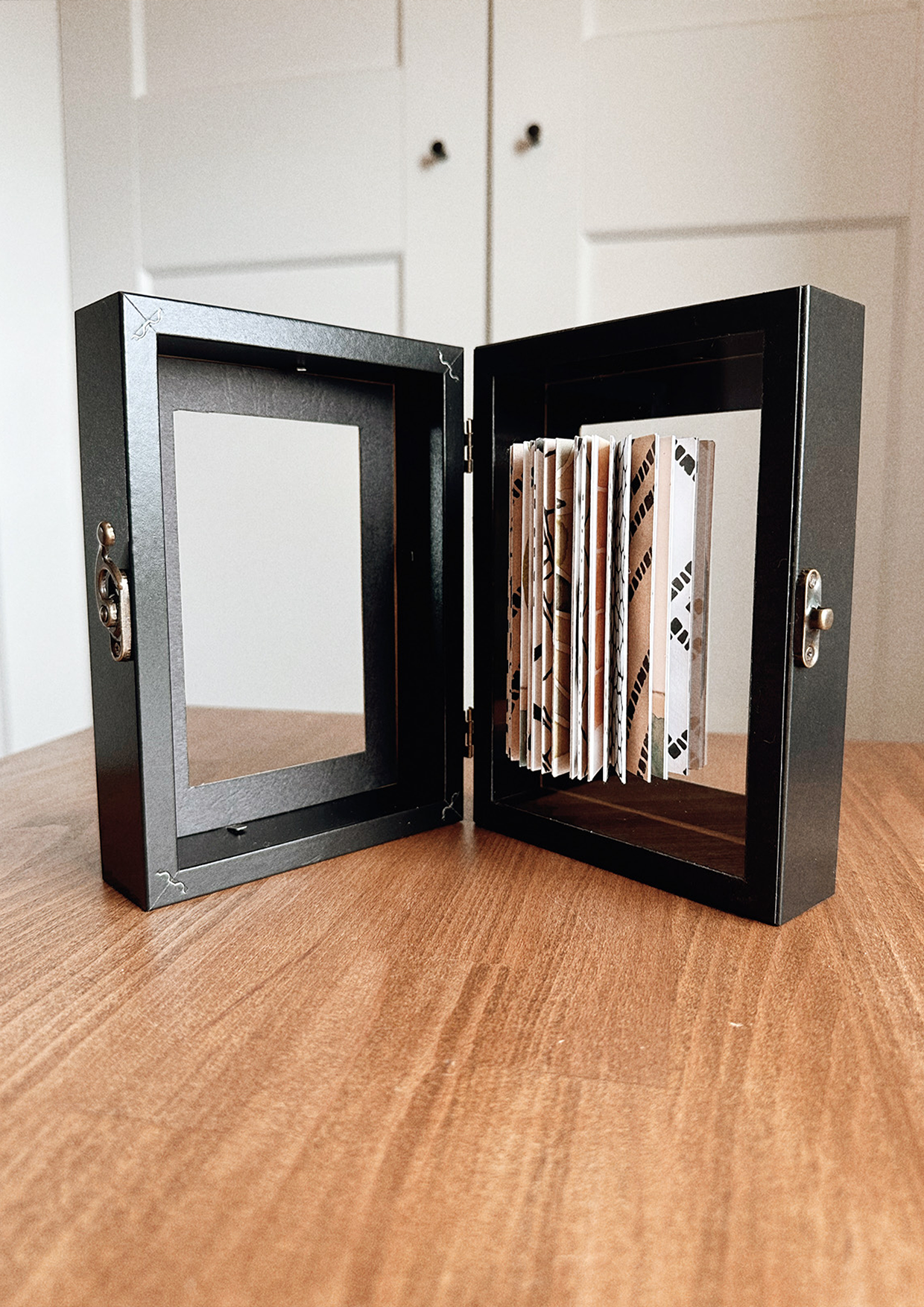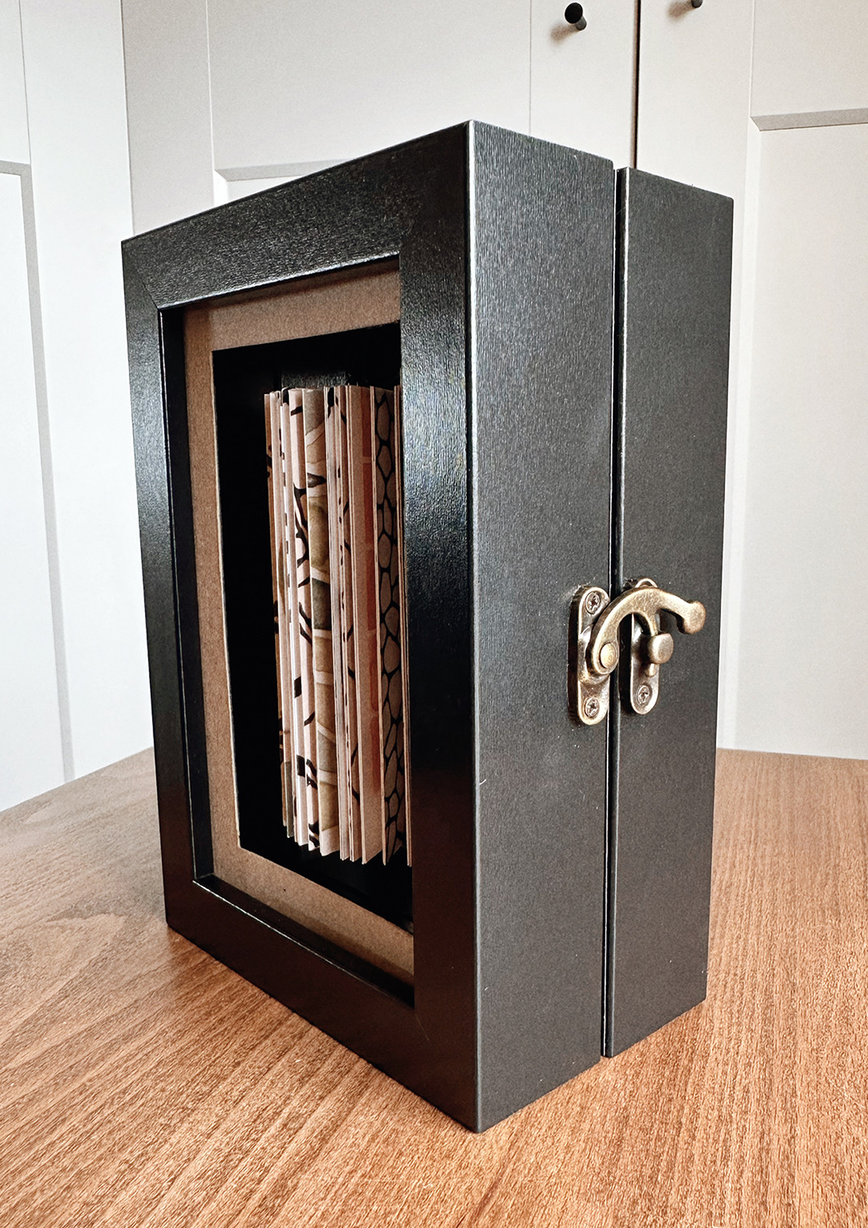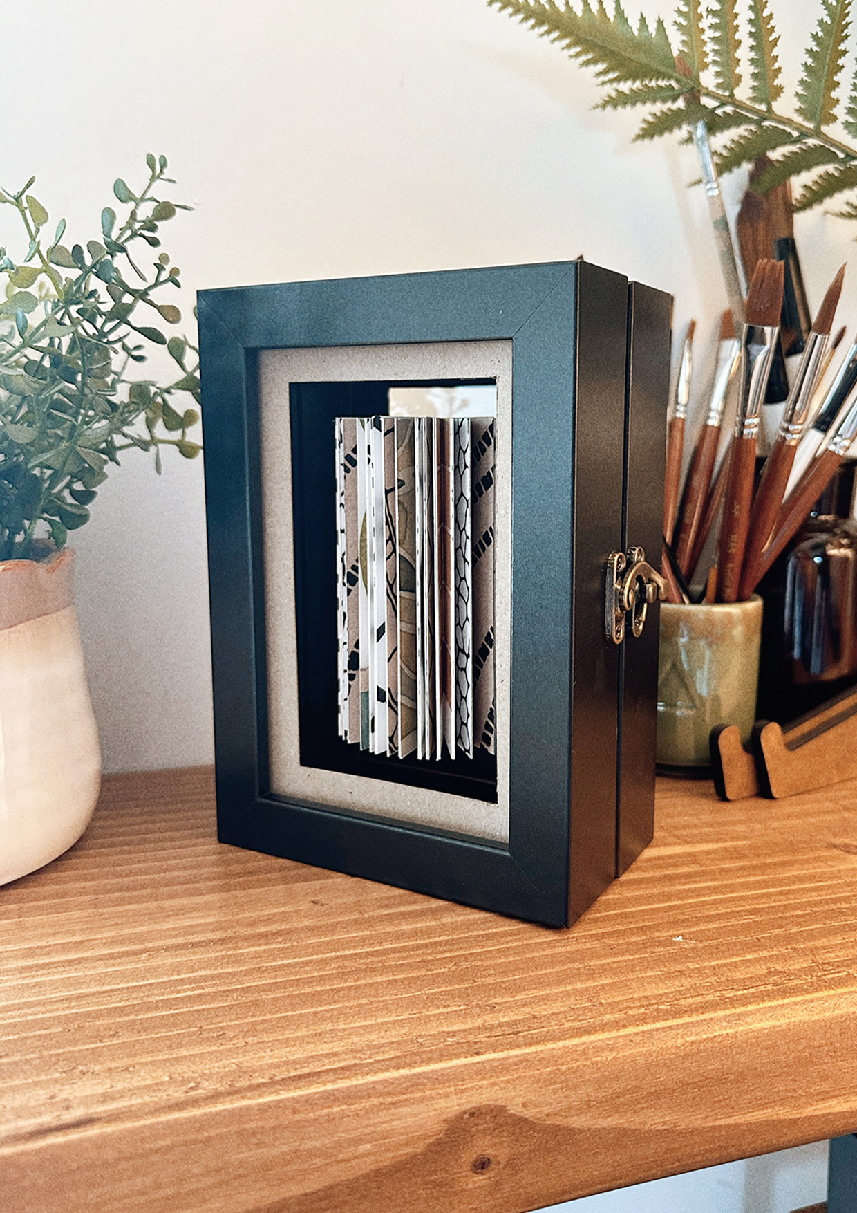 A specially curated selection of patterned paper to create a 360 degree open book, suspended within a frame with an acrylic sheet. Hinge and clap opens the frames.