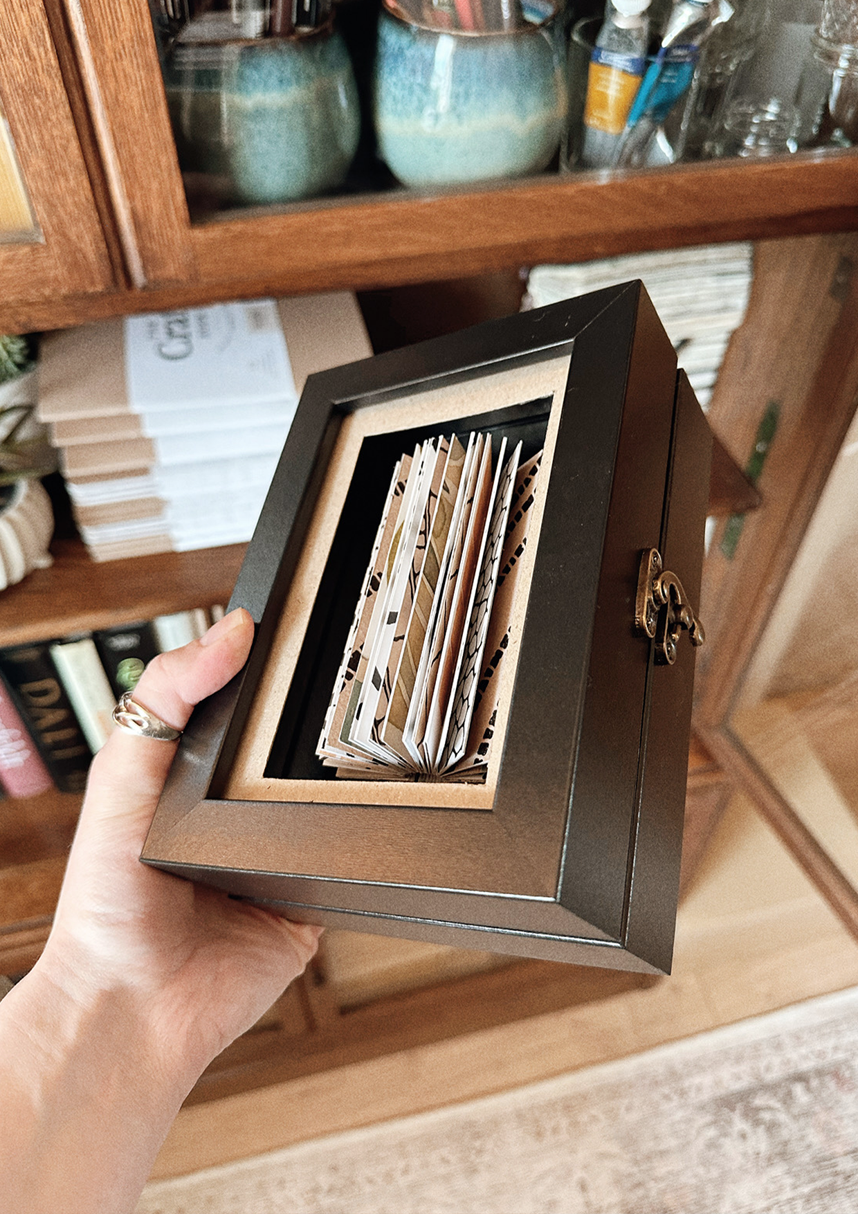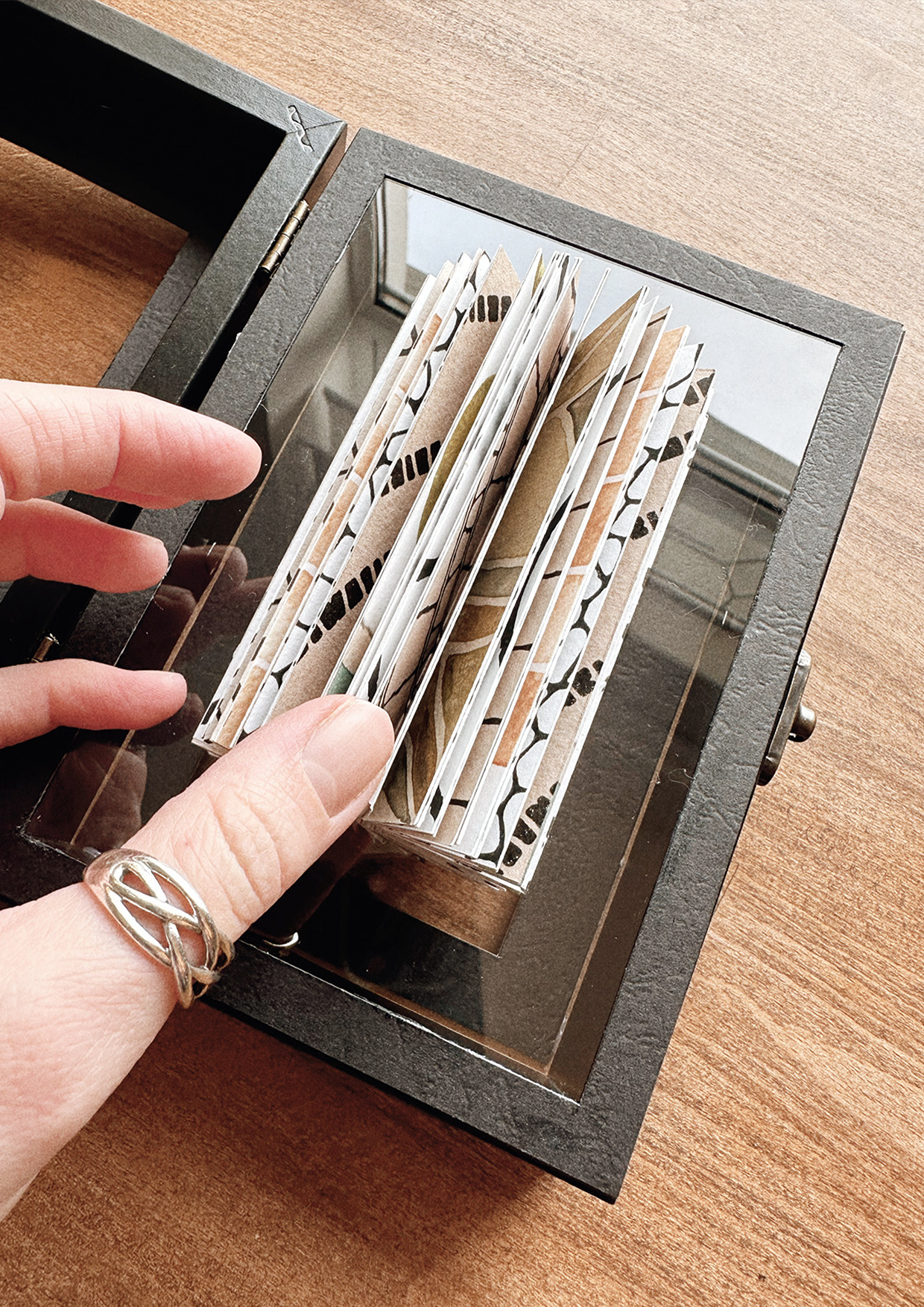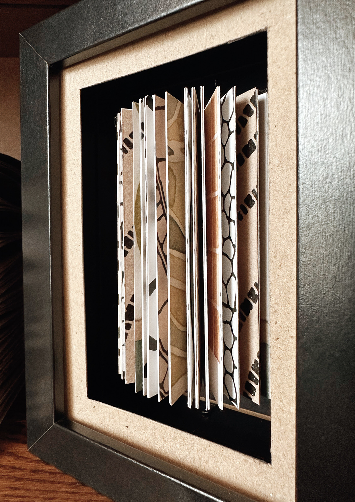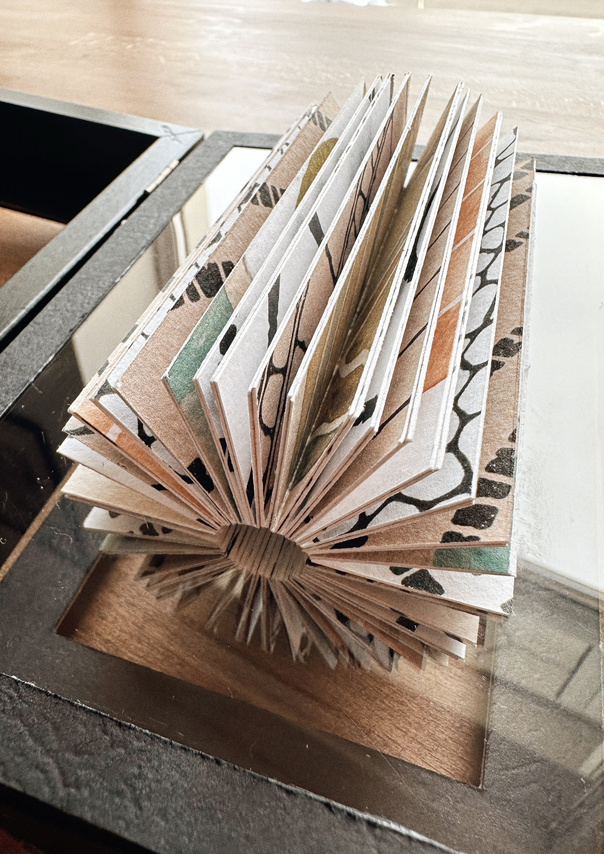 A little book made of patterned papers, inside-out and floating in the air, contained within little frames which open up.